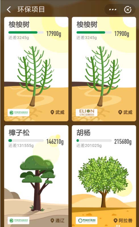 1、回到蚂蚁森林的主界面,点击右上角的“种树”按钮,就能进入到“环保项目”的选择界面。
