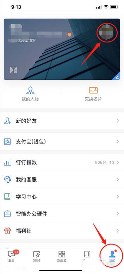 2、点击右下角“我的”,然后点击名片里的头像。