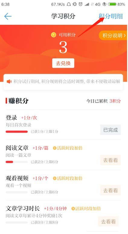 3、在学习积分的右上角,有个积分明细。
