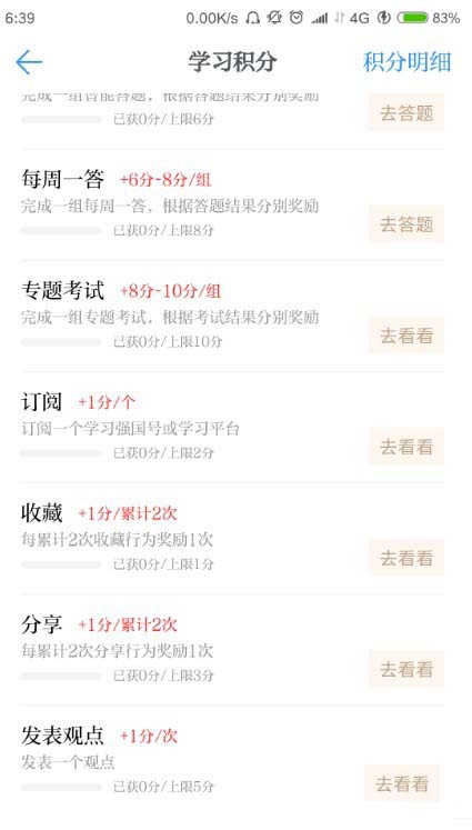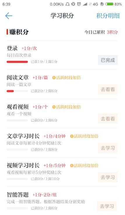 学习强国app中可以通过不同的任务获得相应的积分,不过同种任务每日获得的积分是有上限的,到达上限再做任务,就不会再获得积分想要查看积分的获得情况,该怎么查看呢?下面我们就来看看详细的教程。