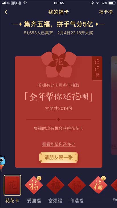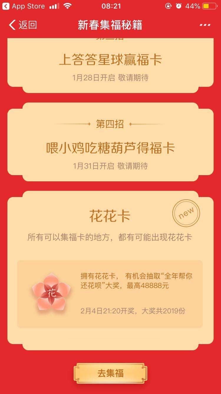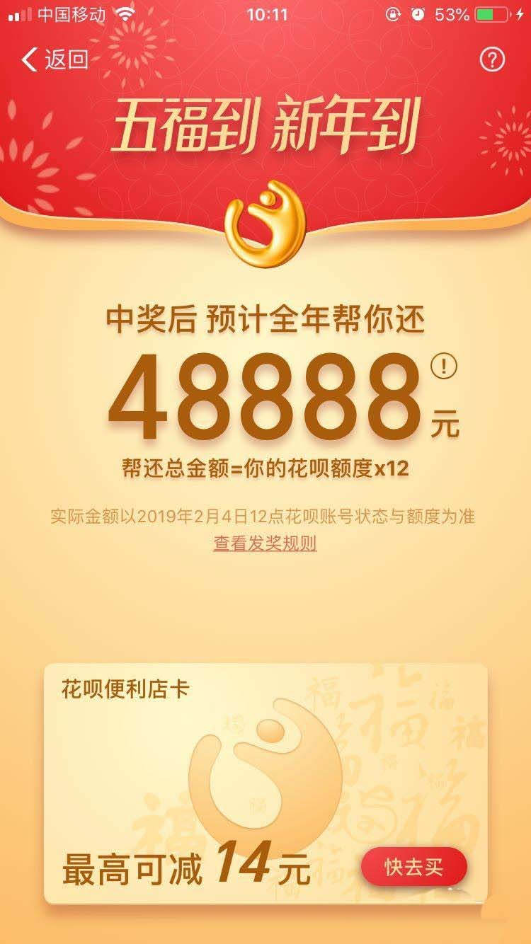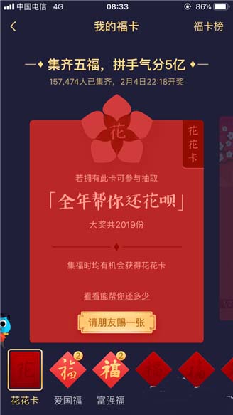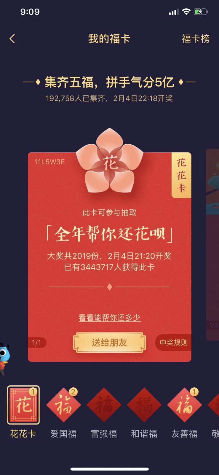 除五福外这次还多了花花卡,任何任务都有几率获得花花卡。拥有花花卡的童鞋可以参与抽奖,名额2019个,抽中来年官方帮忙还花呗。