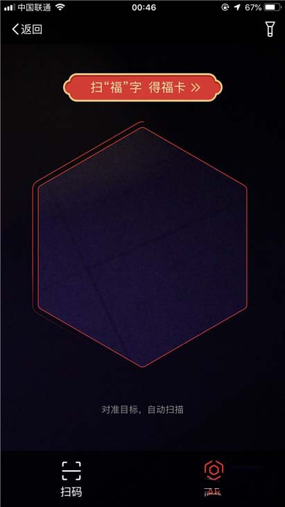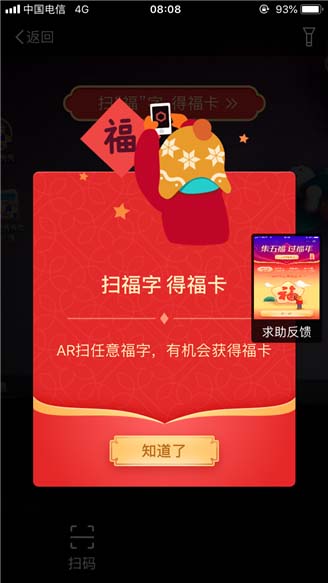 打开支付宝AR镜头扫描任意福字(包括手写和印刷的花式福字),均有几率获得福卡,小编亲测每天最多可以获得两张福卡。