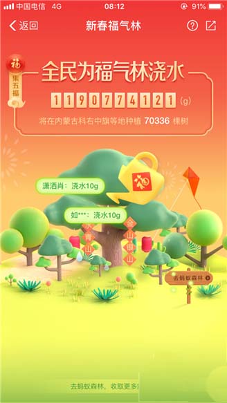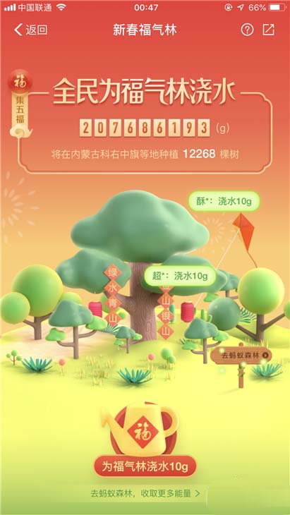 扫到两张福卡后继续扫描就剩下一些没用的祝福了,达到上限后提示去福气林浇水。或者点击步骤2“蚂蚁森林”选项也可以赚到福气林。进入后点击界面下方的水壶对森林浇水,此环节同样最多获得两张福卡。