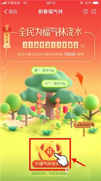 6、是在这个福气林来获取哦,不是在我们正常的蚂蚁森林浇水的那个地方来浇水,这样才能再次获得2张福卡。