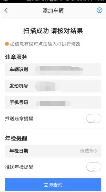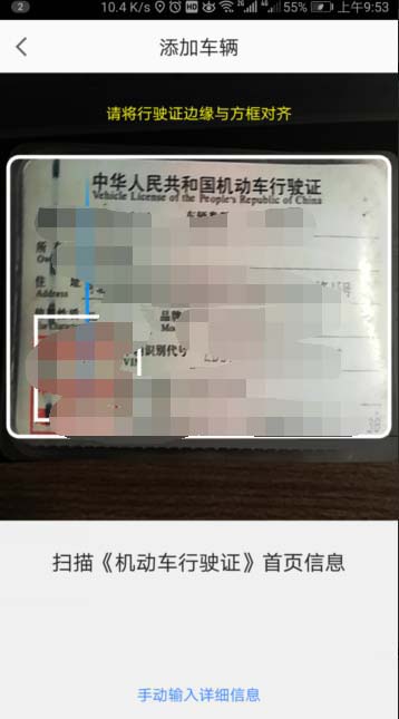 5、这个时候手机出现一个扫描框,把自己的行驶证放在扫描框里进行扫描。