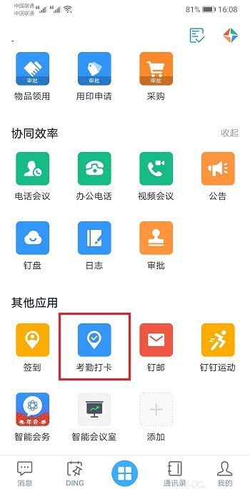 2、如果所在考勤组开启了人脸打卡,我们来看一下极速打卡有没有关闭,点击中间的工作,选择考勤打卡,如下图所示: