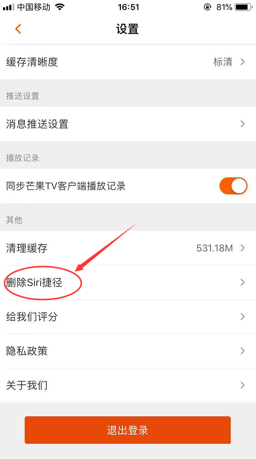 3、点击打开删除siri捷径,进入到手机芒果TV设置页面里,如下图