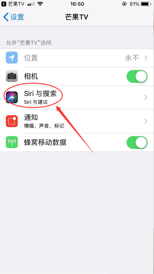 4、然后点开芒果TV Siri与搜索 页面,如下图