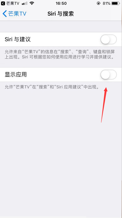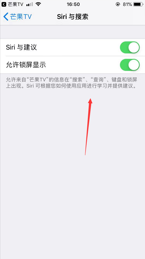 6、关闭后直接返回芒果TV设置页面就可以看到Siri与搜索已经显示关闭,如下图