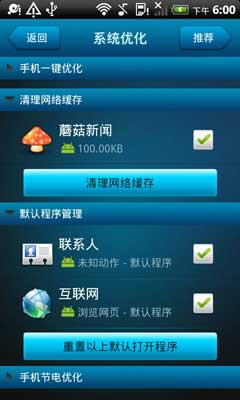 批量操作:点击“清理网络缓存”按钮进入,点击“清除缓存”即可清理当前程序缓存,点击手机“返回”按键,即可进入下一个程序操作界面,所有程序清理完成后,点击手机“返回”按键,返回系统优化界面。
