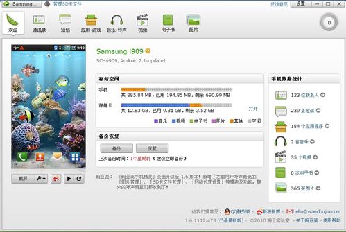 豌豆荚手机精灵是李开复的创新工场推出的一款在PC上使用的Android手机管理的软件。把手机和电脑通过数据线或者WiFi连接上后,即可以将各类应用程序、音乐、视频、电子书等内容传输或者从网络直接下载到手机上,也可以用它方便的备份功能实现联系人、短信、应用程序等备份和恢复(能恢复原来手机上分组和自定义来电铃声及安装的应用程序),可以管理联系人、短信群发、截屏等功能,还能在PC端搜寻安卓软件并将它安装到自己的手机上。豌豆荚手机精灵是安卓手机不可多得的好助手,建议使用i909的朋友一定要安装这个软件,它还能为需要安装Samsung Kies(很多朋友觉得Kies安装不成功主要是缺乏驱动)的i909自动下载所有驱动,为顺利安装Kies打下基础。