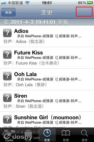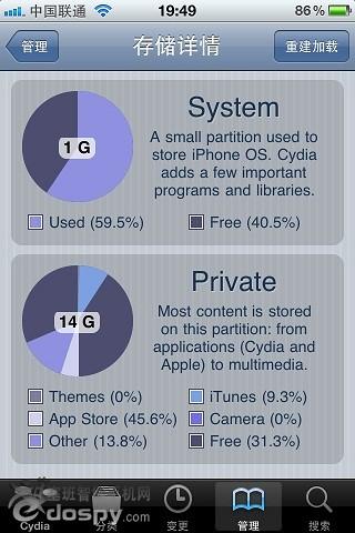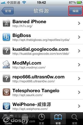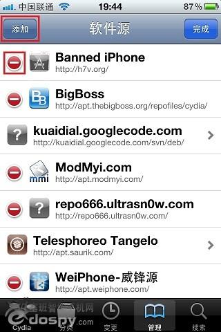 Cydia下端的黑色工具栏共五个按键,分别是“Cydia”、“分类”、“变更”、“管理”、“搜索”,下面一一说明其具体功用。先从最重要的源添加,即“管理”讲起。