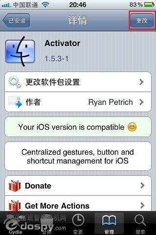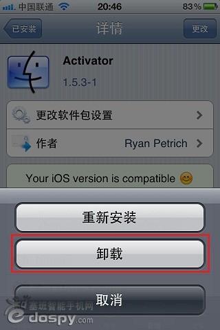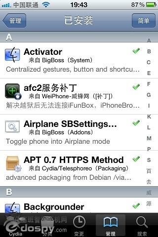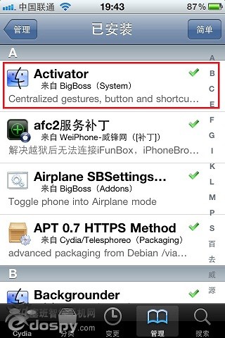 点“管理”,再点“软件包”,来到如下图界面,所有在Cydia中安装的deb程序和补丁都会在此列表显示,假如我要删除一个名为Activator的软件,在此列表中点它