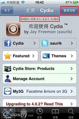 下图是Cydia的Home首页,和App Store有点类似,是一些热门deb软件的介绍和说明,右上角的“重建加载”键,用于页面显示不正常时,重刷加载页面。绿色的SHSH那一行(下图左),说明了你备份在Cydia的SHSH版本。将Home页面拉到最下(右下图),最下面两行文字显示的是你设备类型、所使用的IOS系统版本、Cydia版本等信息。