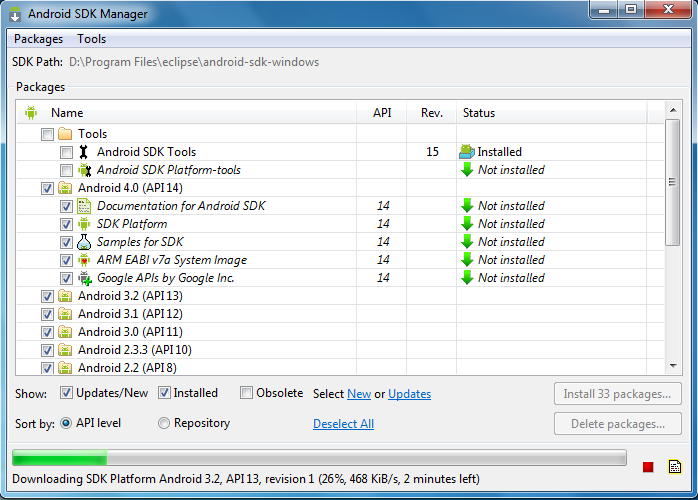 解压后运行SDK Manager.exe文件,运行后如下图,建议将Android1.5到Android4.0全选,一共是33个包,点击Install 33 Packages按钮,安装SDK需要花点 时间,我的带宽是4M还好,大约50mins。