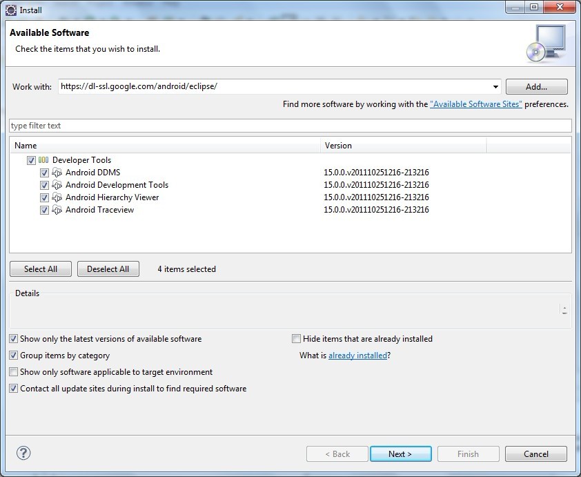 在弹出来的窗口中输入 https://dl-ssl.google.com/android/eclipse/ 然后回车键 > Select All > Next > Finish,就好了,等待安装。。。。