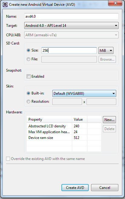 点击上图右边的按钮(像个手机一样的),打开AVD管理器后,点击 New 新建一个模拟器,输入Name 叫 avd4.0,指定 Target 选择 Android4.0 ,然后再分配 SD Card的大小 256M,最后 Create AVD。