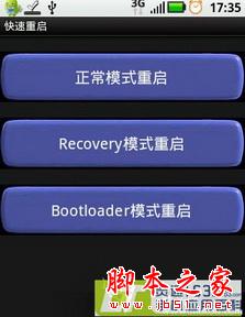 能够快速重启Android手机,保证机子的不必要亏损。包括以正常模式重启、recovery模式重启、bootloader模式重启。