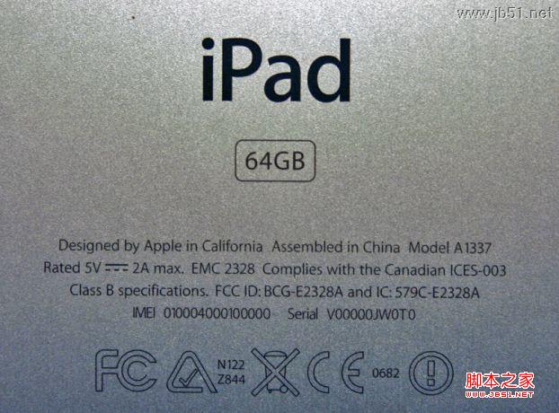iPad 和 iPod touch 序列号都刻在背面外壳底部附近,如下面 iPad 上所示。MEID 和 IMEI 编号(如果适用)也刻在 iPad (Wi-Fi + 3G)、iPad 2 (Wi-Fi + 3G) 和 iPad (WLAN + Cellular) 的背面。