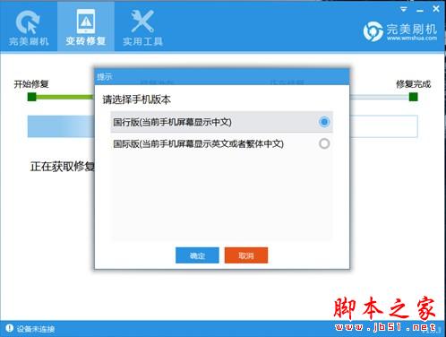 如果您在操作时选择了错误的手机版本,那么完美刷机将不能成功地完成手机变砖修复,这时软件会在“修复失败”页面对您的误操作进行提示——“地区版本选择错误,请选择与本次操作不同的版本重试”。