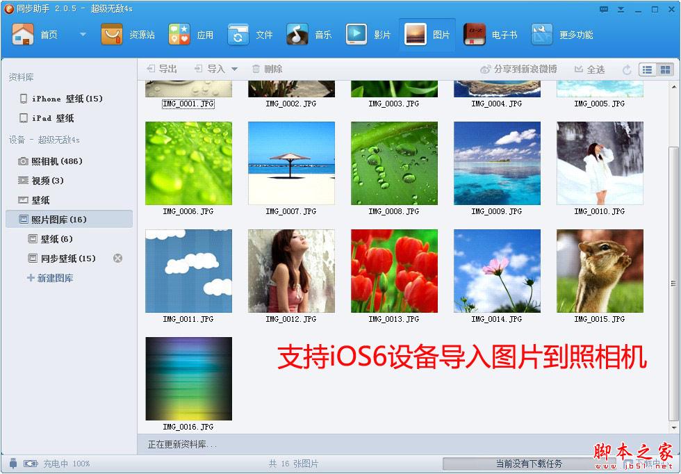 由于iOS本身系统的限制,照相机的图片通常都是“能出不能进”,同步助手2.0.5支持iOS6设备导入图片到照相机,方便用户随时收藏照片和图片。