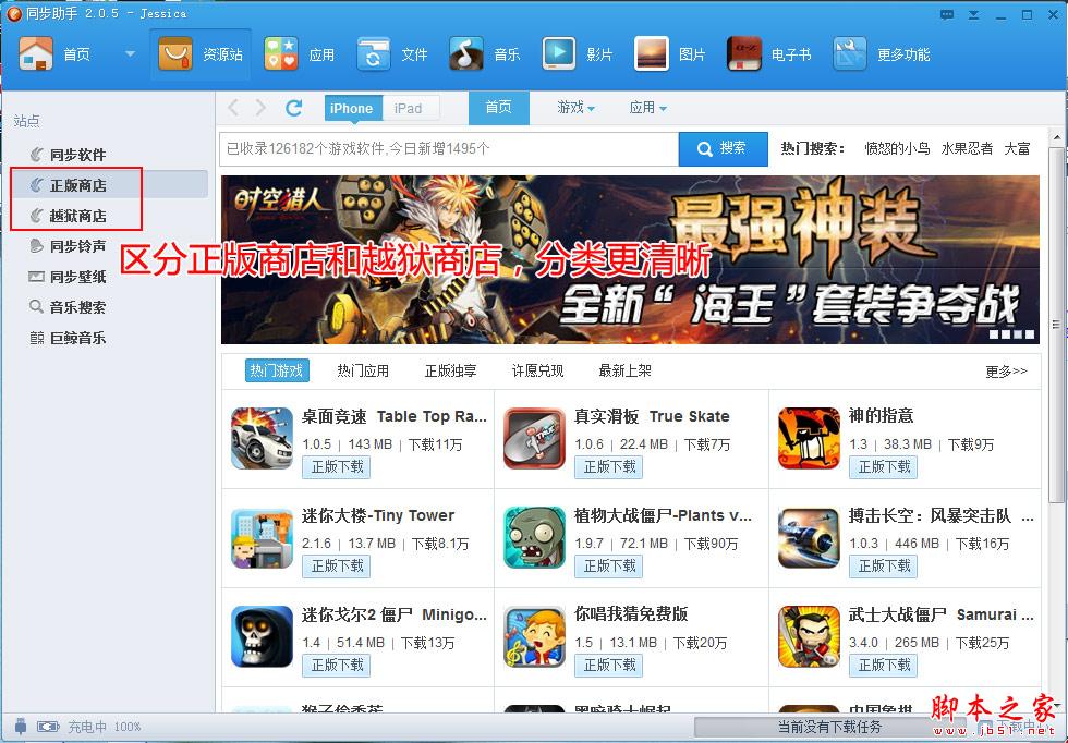 现今下载App有三种方法:通过苹果官方App Store、正版体验和越狱破解版,新版同步助手将正版商店和越狱商店分开,用户可以自由选择要下载的版本,使用更清晰明了。