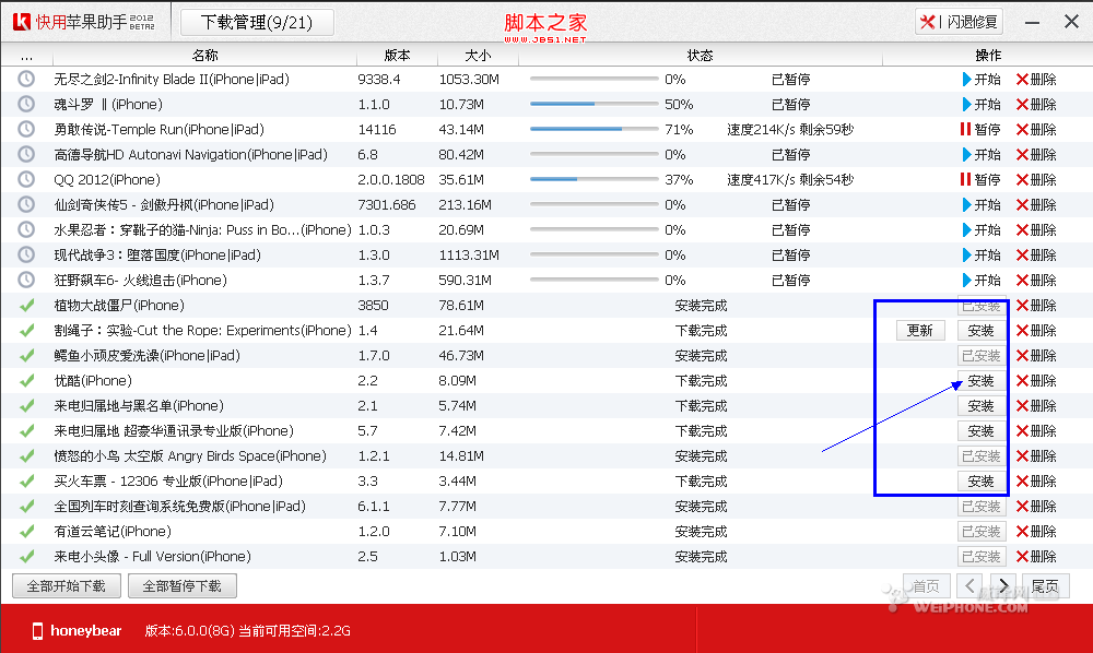 下完就装吧,把你的iphone/ipad拿来,把数据线插到Ta的PP上,点击安装。