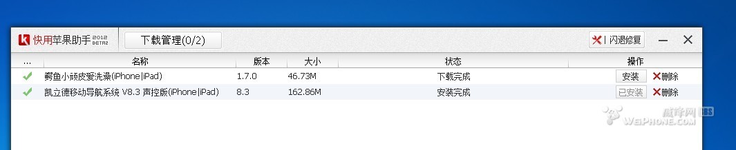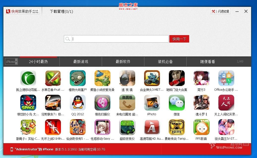 快用苹果助手是一款刚刚推出不久的苹果设备PC端辅助工具,突破性的实现了在【无需设备越狱】【无需iTunes及其账号】的情况下,在【软件内的搜索、下载与安装应用】60000多种收费应用与免费应用通吃。
