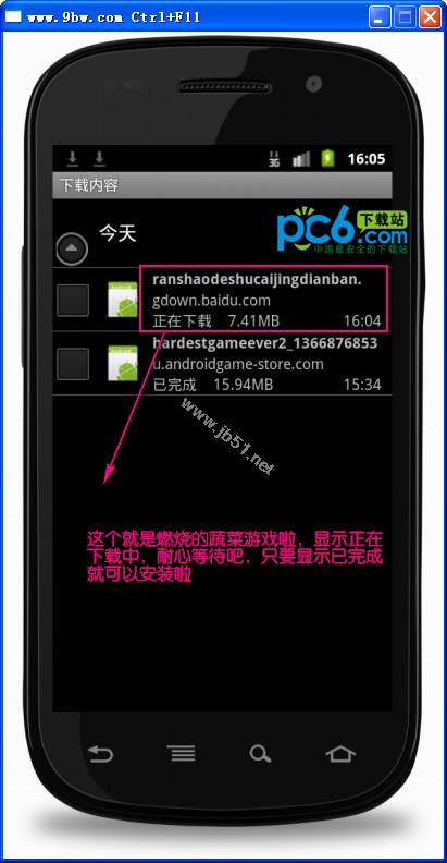 然后切换到主界面,点电话与浏览器中间那个图标,进入下载内容。就可以找到刚刚下载的游戏啦。只要显示已完成就可以直接点进,然后选择安装就可啦。