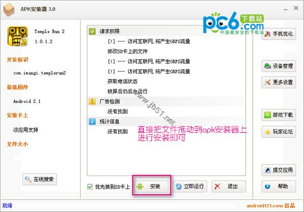 当出现安装成功字样即OK使用APK安装器,必须安卓模拟器处在开启状态,然后打开APK安装器,选择已下载到电脑中的APK应用程序,再点安装,出现成功即可应用程序必须为APK文件,可以下载应用程序安卓版,安卓版的都是APK。软件名称:APK安装器v3.0 免费版 软件大小: 2.7M