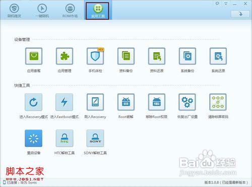 安装完成后直接运行“刷机精灵”,如果程序会自动搜索并下载安装与当前手机匹配的驱动程序。 驱动安装完成后,点击主界面上方的“实用工具”选项卡。