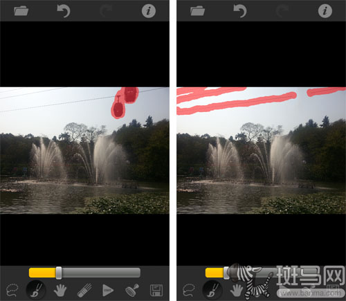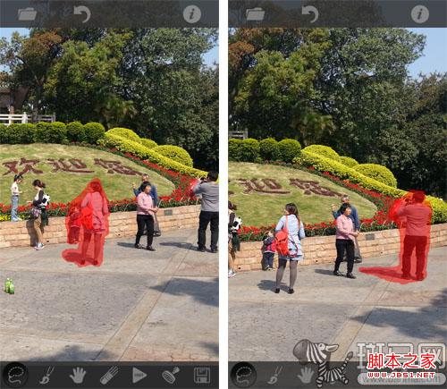 之后选中“笔形”画笔图标,然后用手指直接涂抹画面中想要移除的区域,选中的地方会被半透明的红色覆盖。如果误选了不需要处理的部分,则可以点选“橡皮”图标,然后用同样的操作方式将红色区域擦除。期间还可以使用滑块条调整画笔和橡皮的粗细程度,以便更精确的选中需要擦除的区域。
