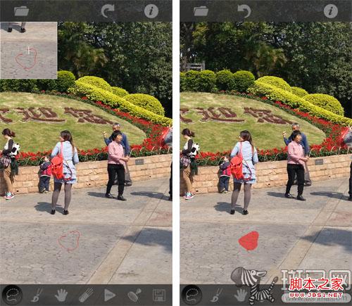 在工具栏中选择“套索”工具,然后将需要擦除的部分用描边的方式圈起来,被圈中的部分就会自动被红色覆盖。借助描边时屏幕上面出现的同步放大工具,可以达到比较精细的区域选择效果。
