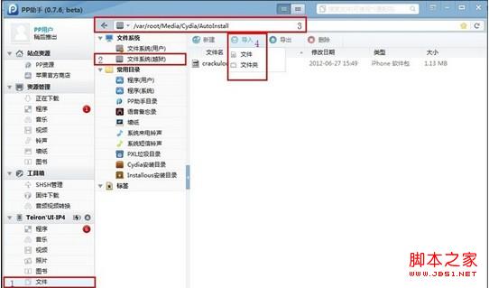 2.将手机连接电脑打开PP助手--文件--文件系统(越狱)--路径:/var/root/Media/Cydia/AutoInstall(将deb格式的Cydia插件导入。路径可以随便只要自己记住就可以。)