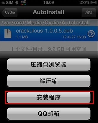 3.通过iFile(文件管理)打开路径:/var/root/Media/Cydia/AutoInstall(这路径是自己导入deb格式),点击软件进行安装(安装后没有请重启一次)。