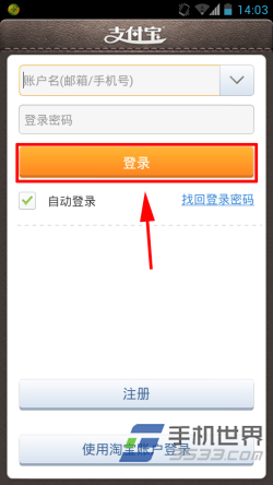 2)打开应用后点击界面上面的账户信息栏,跳出支付宝登录界面。输入账户密码后点击“登录”。(如下图所示)
