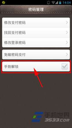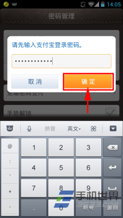 4)在“密码管理”界面点击“手势解锁”,会跳出提示需要输入支付宝登录密码,输入后点击“确定”。(如下图所示)