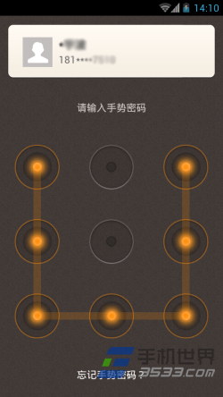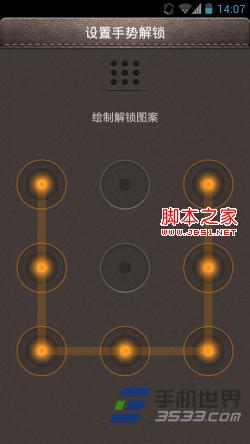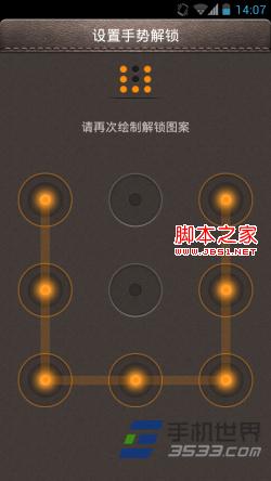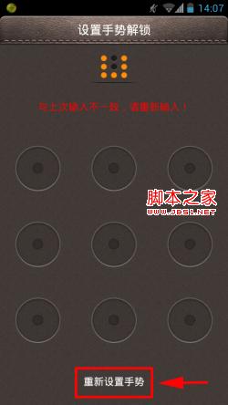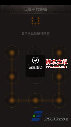 5)进入手势密码设置界面。用手指在九个圆点中进行连线绘制出任意图案,图案必须是一次性连成的。手势密码需要输入两次,两次输入一致后会提示设置成功。如果手势输入不正确会提示重新输入,点击“重新设置手势”即可重新输入。或者设置时想换另一个手势,可以随意输入,然后也会弹出界面提示重新输入。(如下图所示)