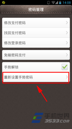 6)手势密码设置成功后如果大家想取消掉,可以进入“密码管理”界面点击“重新设置手势密码”进行重设。同时手势密码设置成功后,用户登录时会弹出手势密码输入界面,需要输入手势后方能登录支付宝账户。(如下图所示)