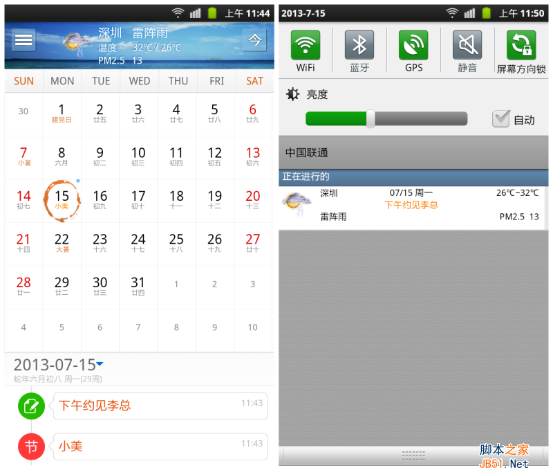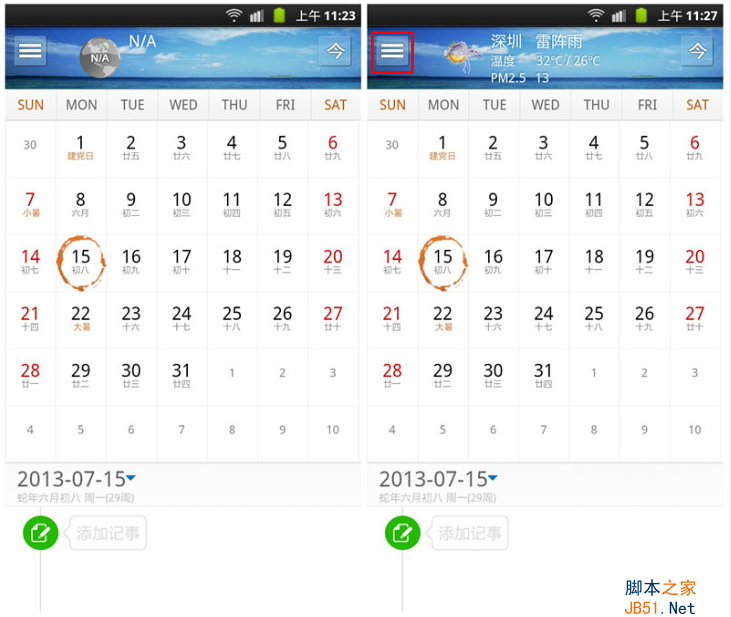 接下来就进入到了日历主界面,在手机没有联网的情况下,日历不能更新实时天气,联网情况下,天气更新很及时。天气预报会显示天气图标、温度、PM2.5值,能让我们看到天气预报的第一眼就很清楚的得知详细的天气信息。日历显示页面,当天日期采用圆圈设计,显小清新而不呆板。农历阳历对照显示,可自由进行农历、公历及黄历查询,我们不会错过任何一个重要的节日。