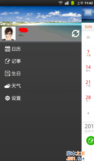 点击日历左上角的图标,就可以使用日历的更多功能,人生日历便会显示如下,查看日历、记事、生日、天气及设置等相应功能,可以了解人生日历更加贴心的功能设计。