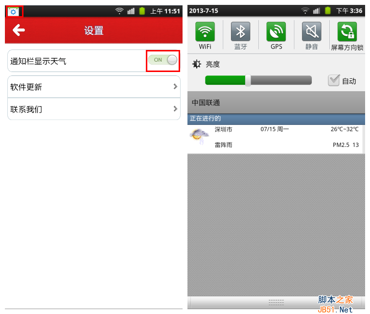 在设置选项,我们可以设置在通知栏显示天气,当我们将按钮滑至ON时,手机通知栏会出现人生日历的图标。打开通知栏的下拉菜单,我们能够看到人生日历详细的天气显示。平时拿着手机只要轻轻一滑,就可以很清楚明了的看到当日的天气状况。