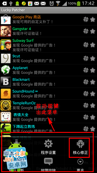 安装成功之后,直接进入程序。开始程序会加载数据,圈圈转玩之后,按手机功能键!才能出幸运破解器的主菜单,里面就有核心修正的选项