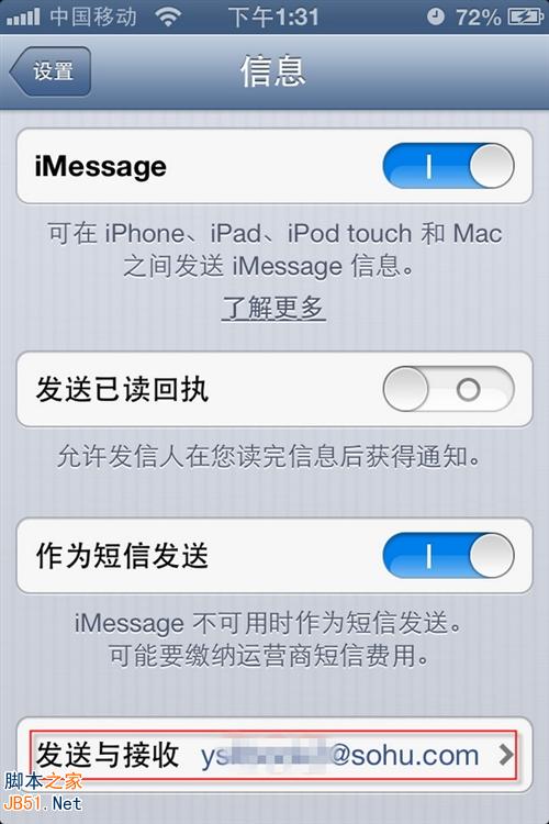 STEP1:在“设置-信息”界面下,如果已有账号登陆,那么iMessage是处于开启状态的。要切换账号,先在下方找到“发送与接收”一项,会显示当前登陆的账号邮箱,点击它进入下一个界面。