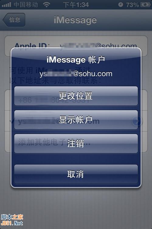 STEP2:进入iMessage账号管理界面里,在这里你会看到当前登陆iMessage的Apple ID账号。点击该账号弹出管理菜单,点击“注销”按钮。