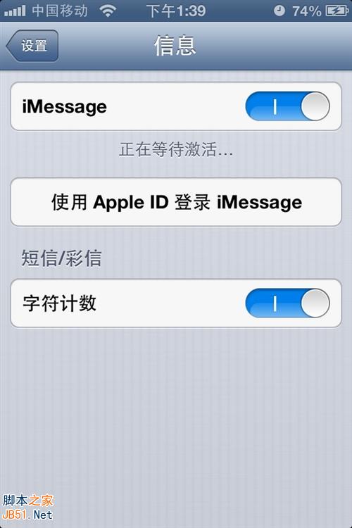 STEP3:自动返回“设置-信息”界面,此时iMessage功能便已处于关闭状态,再次将其开启时会有一个激活提示出现,点击“好”不用理会。然后点击“使用Apple ID登录iMessage”按钮,开始用新账号登陆。