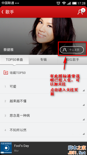 查看入驻歌手,其他列表显示的有的则不是入驻歌手,不能关注
