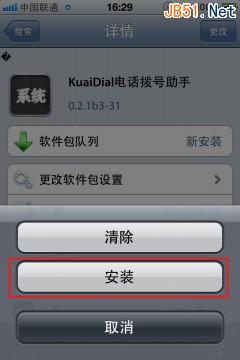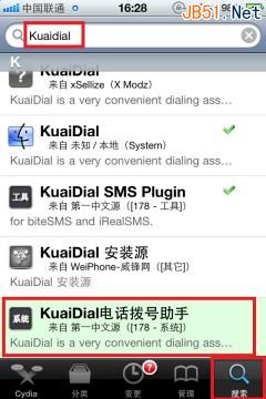 首先安装kuaidial 打开Cydia, 搜索kuaidial并安装 如图: