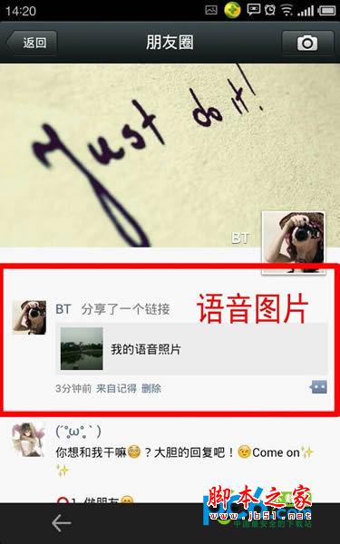 微信朋友圈发语音需要借助另外一款app软件,那就是记得”,这个软件有一个语音相册,打开微信,在附加栏通过“记得”选择图片,录音,然后分享到朋友圈。就可以有语音图片出来了。