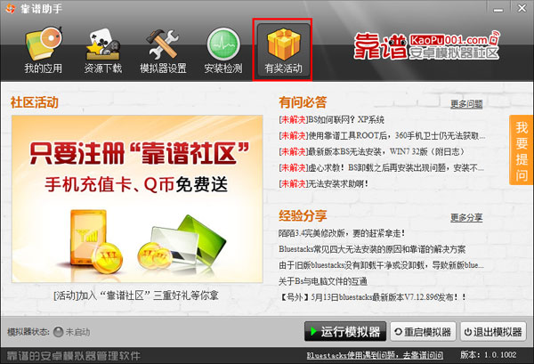 点击"靠谱助手"中的"有奖活动",可以查看靠谱社区最近举办的活动,或者查看网友们在使用模拟器方面的经验分享,还可以进入以在有问必答板块发帖询问,靠谱的专家们帮你解决模拟器使用上的难题。